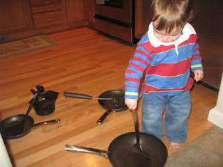 He hearts utensils & can occupy himself for quite a while with one in hand... He is esp partial to spatulas and you should've seen his eyes light up when I pulled out 4 @ one time!